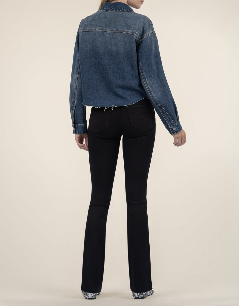 This denim jacket features a stylish frayed hem, drop shoulder design, and patch front pockets, offering a perfect blend of casual cool and modern trendiness. The relaxed fit and thoughtful details make it an effortlessly chic addition to any casual wardrobe.